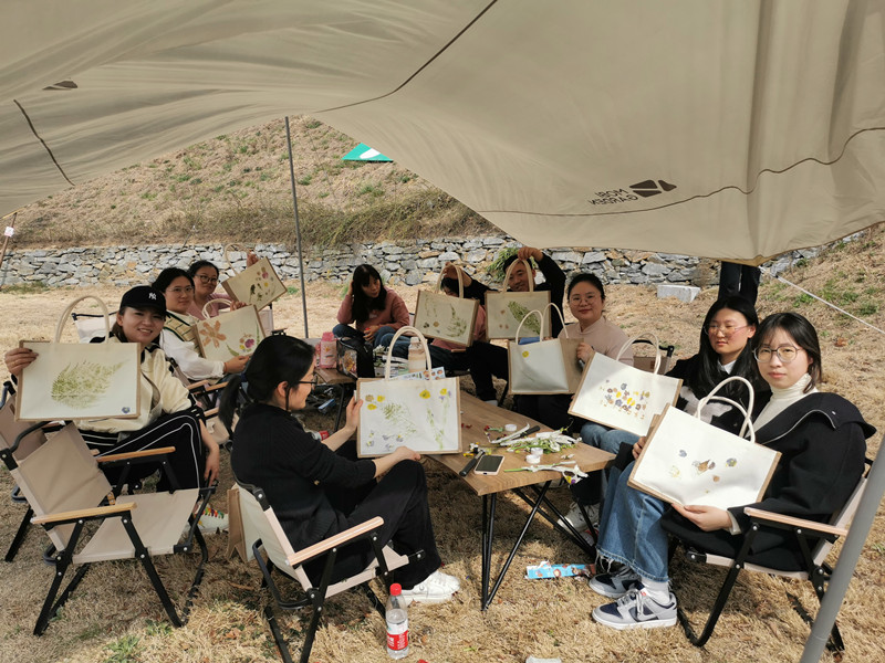 三月春意盎然,大家在指定區(qū)域采集新鮮植物,并通過自己的設計將植物拓染在帆布包上,留下了春天的印記,把春色“袋”回家。